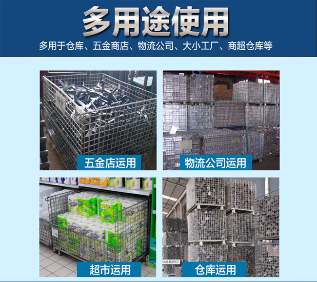 | 型號(hào) | 外形尺寸 | 線徑mm | 網(wǎng)目mm | 容積m3 | 腳高mm | 承重kg | 堆疊層數(shù) | 裝箱數(shù)量(臺(tái)) | |||